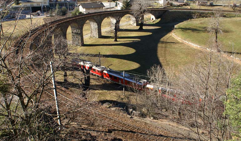 Durante il giorno più corto dell’anno, il 21 dicembre, il famoso viadotto di Brusio disegna delle grandi ombre sui prati sottostanti, evidenziando ancora di più l’eccezionale opera ingegneristica realizzata tra il 1908 e il 1910.