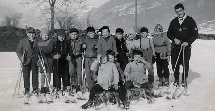 Allievi della 1a e 2a classe elementare della scuola di Le Prese (annate 1950-1951) con il maestro Plinio Bontognali nell’anno scolastico 1958-1959 in occasione di una lezione di ginnastica sugli sci nei pressi di Spinadascio (Prai Dür).