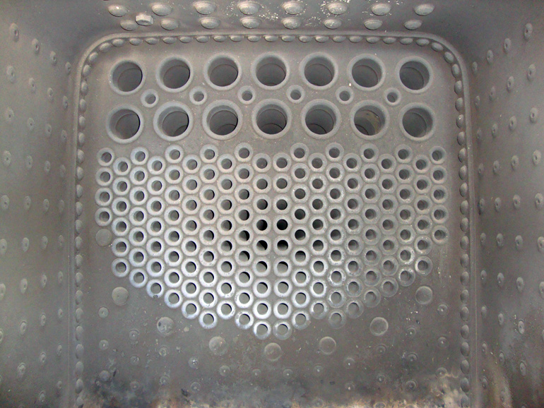 Camera del fuoco dello spazzaneve rotativo a vapore Xrot d 9213 della Ferrovia Retica acquistato nel 1912 dall’allora Ferrovia del Bernina. In alto le canne fumarie (fori grandi) al cui interno sono inseriti altri tubi per il surriscaldamento del vapore fino a raggiungere una temperatura superiore ai 300 °C. In basso (fori piccoli) i tubi di riscaldamento (ca. 110 m2) che portano all’ebollizione ca. 3300 l di acqua e ad una pressione di 13 atmosfere.