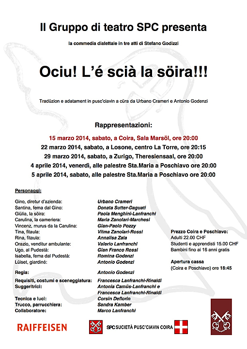 La Società Poschiavini in Ticino (SPT) ha il piacere di ospitare a Losone il Gruppo Teatro della SPC Coira, che porterà in scena la commedia in dialetto pusc’ciavin “Ociu! L’è scià la söira!!!”.
