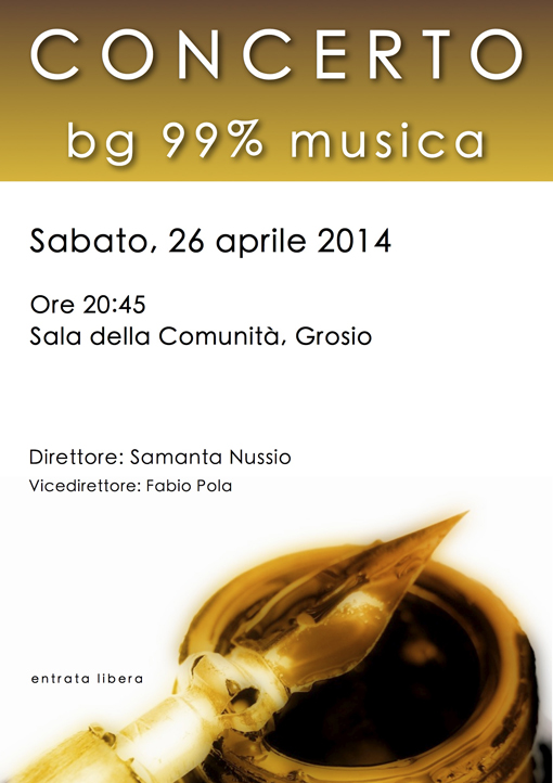 Diretta dalla promotrice della stessa banda Samanta Nussio – mentre il vicedirettore sarà il giovanissimo Fabio Pola – la bg 99% musica darà dunque prova di grande e originale coerenza: dei giovani suoneranno brani composti da giovani. L’appuntamento è per sabato 26 aprile nella Sala della Comunità di Grosio, alle ore 20:45. La banda giovanile si esibisce infatti a turno in uno dei quattro paesi da cui proviene la maggioranza dei suoi componenti: Brusio, Poschiavo, Tirano e, appunto, Grosio.