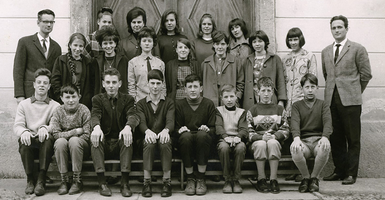 Allievi della 1a, 2a e 3a classe della scuola secondaria riformata di Poschiavo (annate 1949-1951) con i maestri Riccardo Semadeni (a sinistra) e Egidio Bondolfi (a destra) nell’anno scolastico 1964-1965.