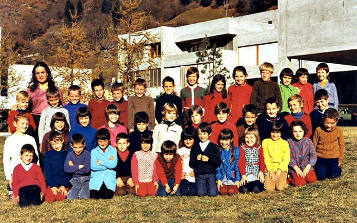 Allievi della 2a classe elementare della scuola di Poschiavo (annata 1963) nel 1971-1972 con la maestra Valentina Menghini.