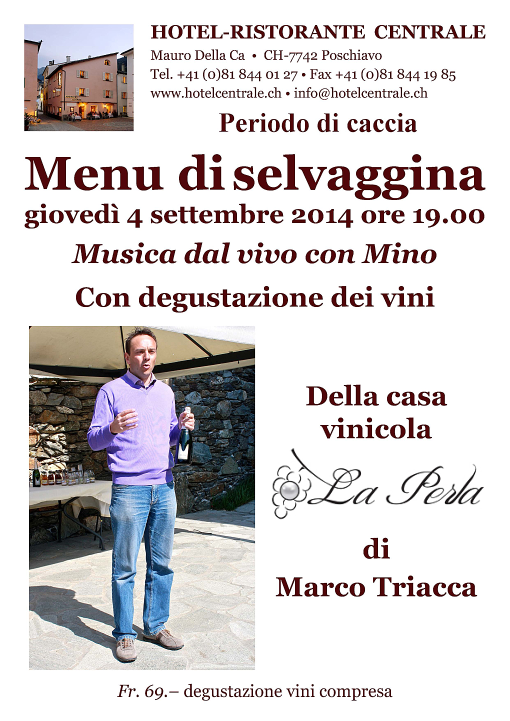 La caccia è iniziata ed ecco a voi una cena a base di selvaggina, abbinata ai vini dell’azienda vitivinicola La Perla di Marco Triacca. Prenota subito un tavolo all’Hotel Ristorante Centrale!