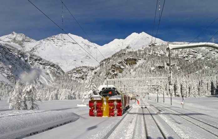 Dopo le abbondanti nevicate in montagna che hanno causato disagi alla circolazione dei treni, il tempo meraviglioso ha dato la possibilità di sgomberare dalla neve anche i binari secondari. Lo spazzaneve a Cavaglia, 19 gennaio 2015.
