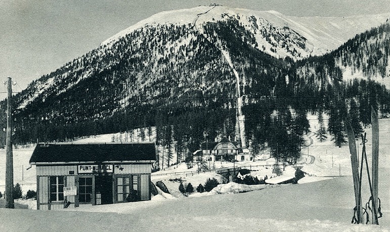 L’apertura della funicolare di Muottas Muragl (sullo sfondo) nel 1907 si rivela fin da subito una grande attrattiva turistica. Alla costruzione della Ferrovia del Bernina si prevede quindi una piccola stazione che consenta ai viaggiatori di raggiungere comodamente la stazione di partenza della funicolare, tramite un ponte pedonale in ferro.