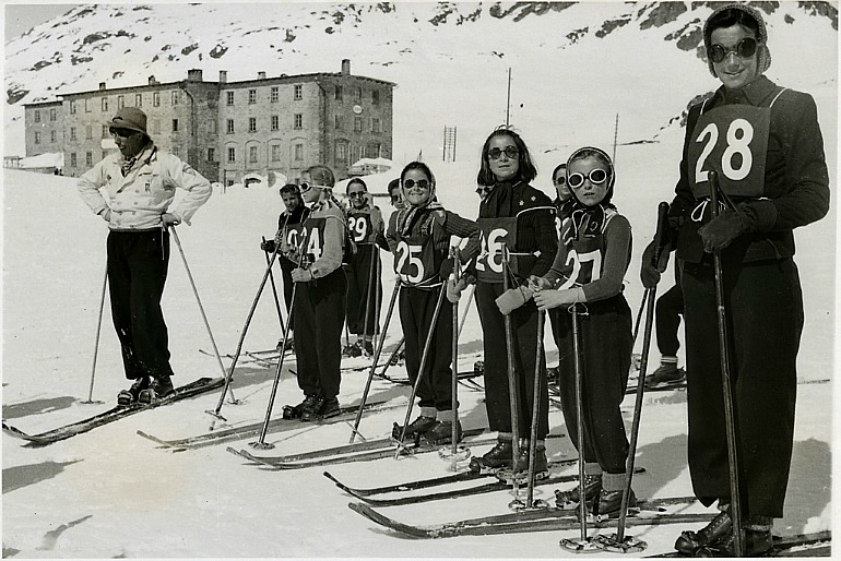 Allieve della scuola riformata di Poschiavo in occasione del corso di sci all’Ospizio Bernina nel mese di marzo del 1941.
