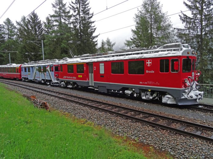 A volte in primavera il tempo fa le bizze e ne emergono interessanti contrasti di colore fra natura, tempo e tecnica. Il Bernina Express alla stazione di Cadera il 20 maggio 2015.