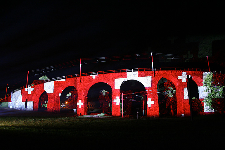 Il viadotto elicoidale della ferrovia del Bernina a Brusio illuminato dall’artista della luce Gerry Hofstetter in occasione della Giornata internazionale del rifugiato del 2006.