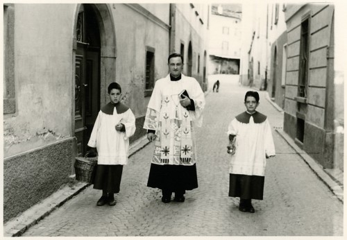 Il prevosto don Leone Lanfranchi in via da Mez per la benedizione delle case