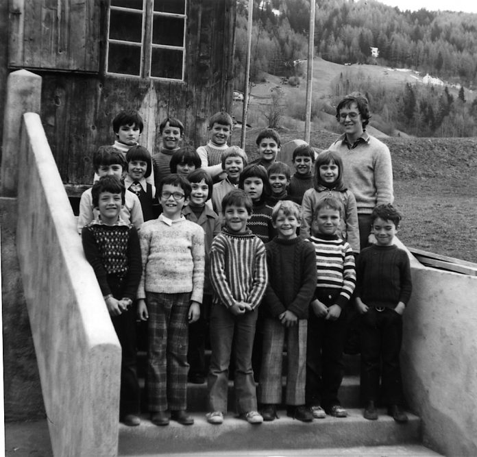 Allievi della 1a e 2a classe elementare di S. Carlo (annate 1969-1970) nell’anno scolastico 1977-1978 con il praticante e futuro docente Giancarlo Sala.