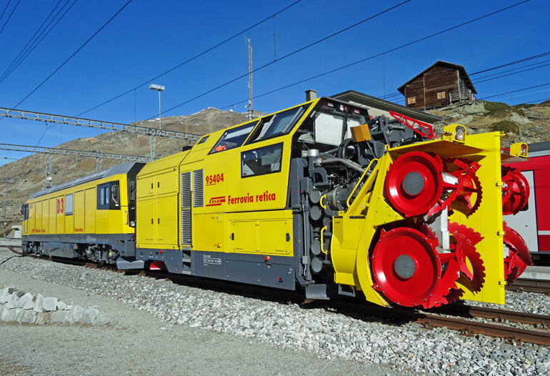 Composizione con la nuova fresa e un nuovo locomotore dell’ultima generazione in sosta all’Ospizio Bernina.