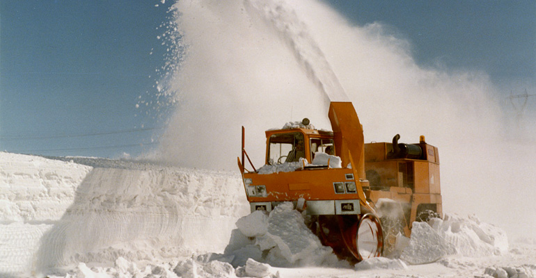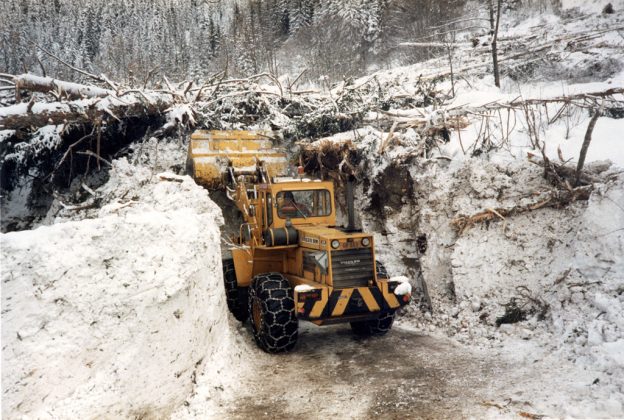 Ruspa intenta a liberare la strada da neve e detriti portati a valle dalla valanga della Val Urezza, febbraio 1986