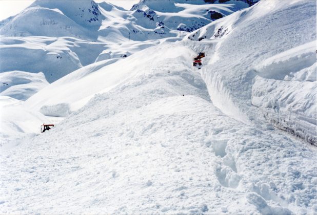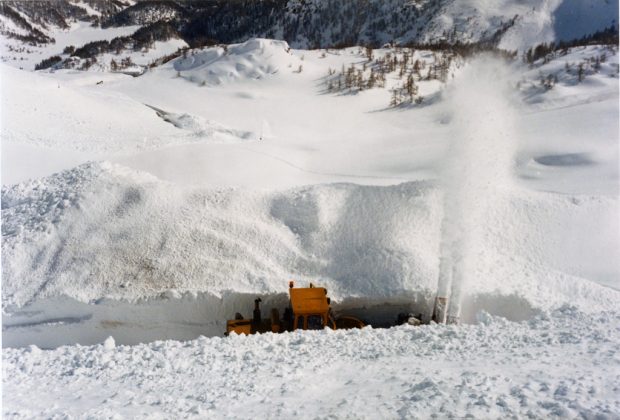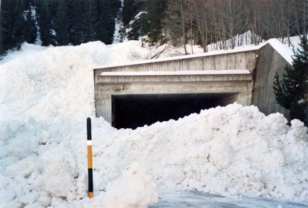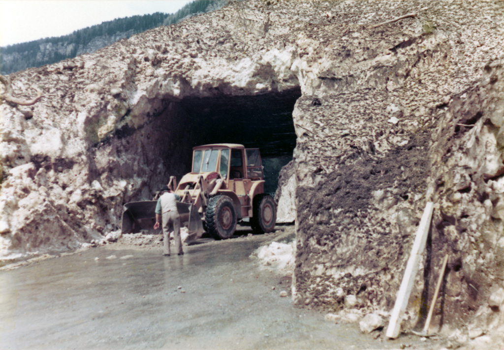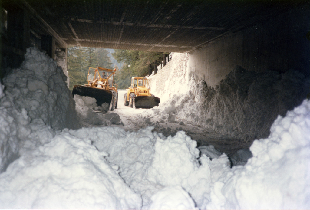 Varco scavato sotto la valanga della Val Urezza per permettere il passaggio delle macchine sulla strada del passo, 1979
