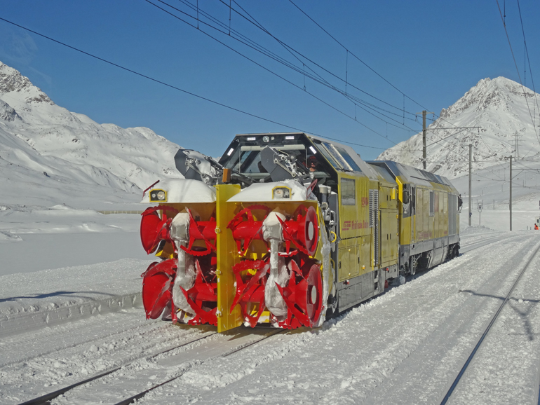 Dopo varie corse di prova effettuate nel corso dell’autunno 2015, all’arrivo della sospirata neve la nuova fresa con locomotore diesel ha superato brillantemente la sfida contro le intemperie invernali. Nei prossimi anni questa composizione moderna garantirà l’apertura invernale della Ferrovia del Bernina. Ospizio Bernina, inizio febbraio 2016.