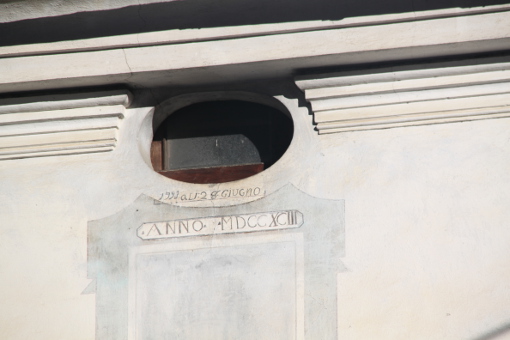 “La data sulla facciata ovest ci rivela che l’erezione si era conclusa il 28 giugno del 1793. Curiosa la doppia iscrizione, una in latino e l’altra in italiano e cifre arabe. Da allora la facciata non è più stata rinnovata e i segni del tempo e dell’incuria sono evidenti”.