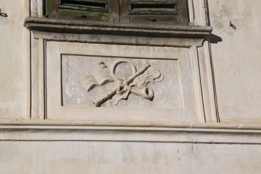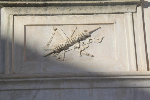 “Sotto un’altra finestra si vedono un fascio, due frecce e un’arpa. Qui ci avventuriamo negli ideali tratti dalla cultura classicista: l’unità, la capacità di discernere e colpire e la leggiadria, elementi che rendono perfetta la vita”.