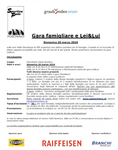 La gara familiare e Lei&Lui, prevista per domenica 20 marzo, è stata annullata per poca partecipazione! Troppe poche le famiglie annunciate: peccato e ci dispiace, al prossimo anno!