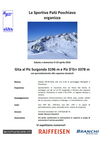 Archivio Gita al Piz Surgonda 3196 m e Piz D’Err 3378 m Di nn - 30 Marzo 2016 0 34 Sabato e domenica 9-10 aprile 2016 Con pernottamento alla capanna Jenatsch. Clicca sull’immagine per ingrandire
