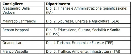 Il Consiglio comunale, giunto alla soglia di metà legislatura, ha deciso di ridiscutere la ripartizione dei dipartimenti tra i cinque Consiglieri in carica. La gestione della Cosa pubblica richiede una costante attenzione nel rispetto delle leggi e delle procedure correnti. La complessità dei compiti oggigiorno, confronta l’Esecutivo con diverse tematiche procedurali, legali, amministrative, tecniche, sociali, ambientali, politiche, ecc. Al fine di evitare in futuro l’insorgere di potenziali conflitti di interesse, il Consiglio comunale ha deciso di riorganizzare i dipartimenti che potrebbero essere toccati da queste problematiche. Dopo aver eseguito un’analisi della situazione attuale e valutato le sollecitazioni politiche giunte dall’esterno, il Consiglio comunale ha deciso la suddivisione dei dipartimenti come contemplato all’art. 7 del Regolamento di gestione del Consiglio comunale nel modo seguente: