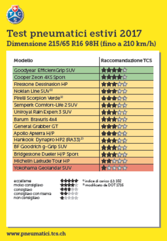- La versione stampata dell’infoguida “Pneumatici estivi 2017” è disponibile, dalla fine di febbraio, in tutti i punti di contatto del TCS o ordinata all’indirizzo www.pneumatici.tcs.ch. È gratuita per i soci del TCS, per i non soci costa 10 franchi.