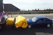 Nell’ambito della campagna di prevenzione “La buona guida – buon viaggio in autostrada”, è stata organizzata una simulazione d’incidente in condizioni reali di traffico. La scena presentava un automobilista, distratto, intento a telefonare col suo cellulare che andava a cozzare contro un camion-tampone intento a segnalare un cantiere. Lo scopo era quello richiamare i conducenti alle corrette regole di comportamento in presenza di cantieri stradali, ricordare che dietro i camion-tampone ci sono sempre degli operai all’opera e dimostrare l’efficacia del dispositivo ammortizzante. Questa simulazione è stata organizzata congiuntamente dalla Direzione generale della mobilità e delle strade, dalla Sezione della circolazione e della navigazione, dalla Polizia cantonale di Vaud e dal TCS. Sul posto erano inoltre presenti i Servizi della Protezione civile e di soccorso della città di Losanna per garantire la sicurezza dell’esercizio.
