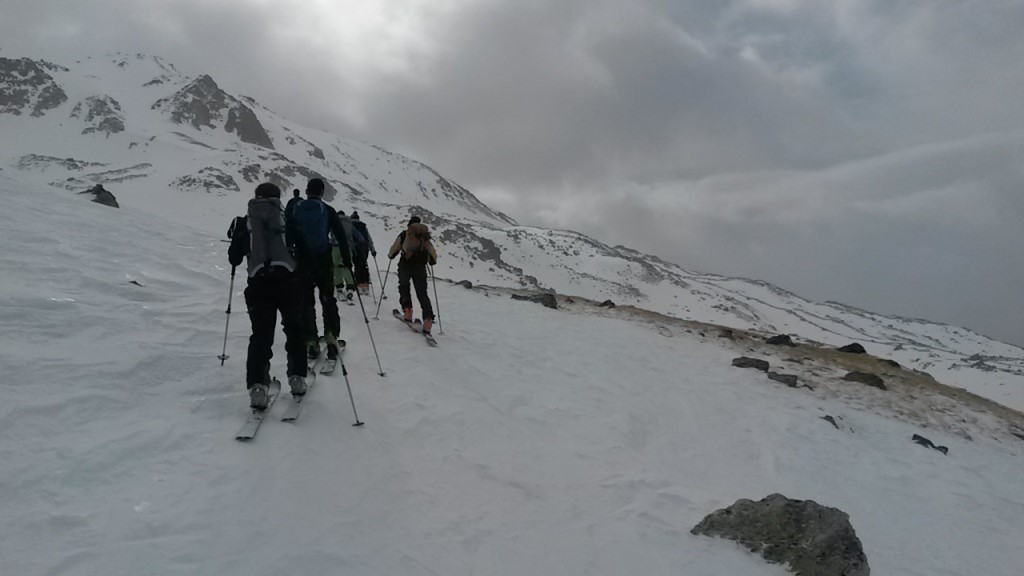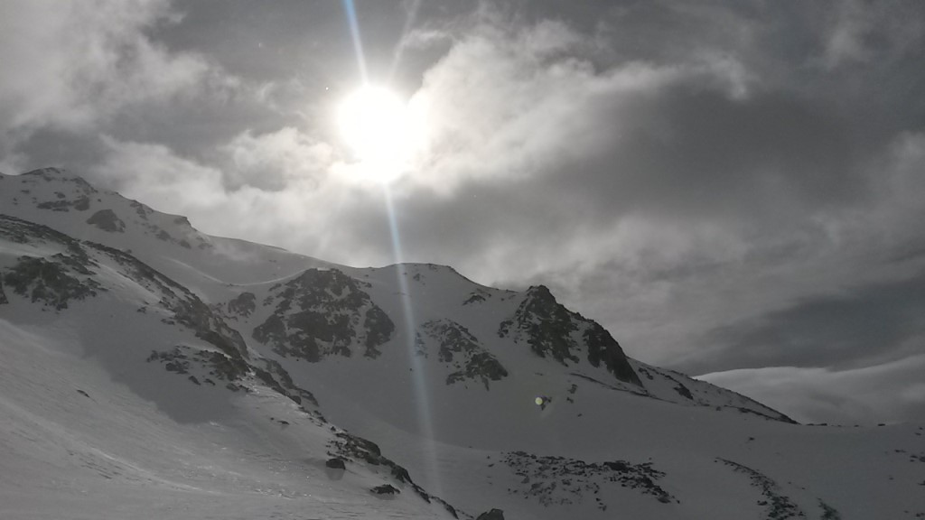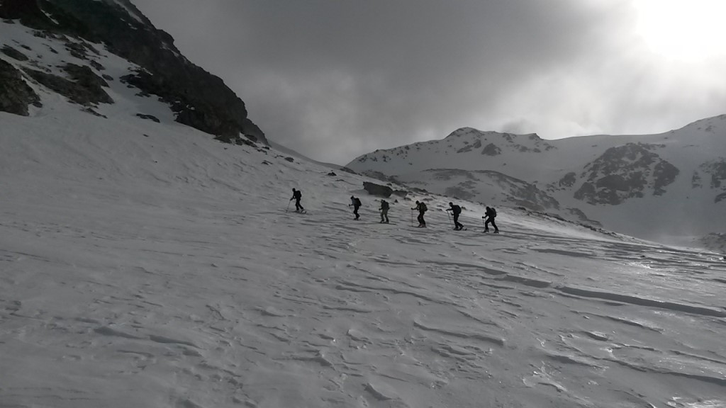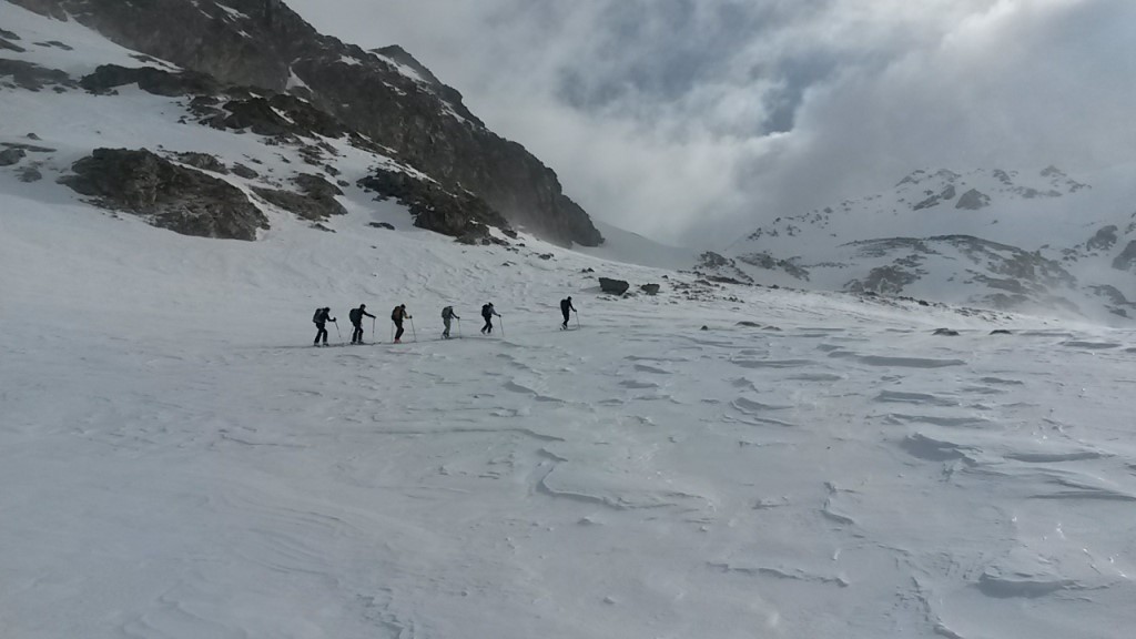 Rimessi gli sci scendiamo verso il Pass da Val Mera, su neve dura e soffiata dal vento; da lì, lungo un ripido canalone, raggiungiamo il Lagh da Roan. Quindi, con un paio di spinte, proseguiamo sulla sinistra per poi imboccare un bel vallone perfettamente sciabile. L’ultimo tratto fino all’Alpe Campo sarà di puro scorrimento a causa della neve molto molle.