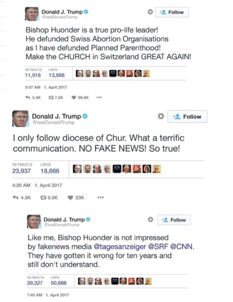 Fra i molti “pesci d’aprile” apparsi nei vari quotidiani e nei portali internet di pubbliche istituzioni non è passato inosservato quello diffuso dal sito della Diocesi di Coira, mediante il quale si voleva far credere che, per quanto riguarda la Svizzera, il Presidente degli Stati Uniti Donald Trump segue su Twitter solo la Diocesi di Coira. Commentando la notizia, lo stesso ufficio stampa della Curia manifestava accondiscendenza per le attenzioni di Trump, non nascondendo il fatto d’essere lusingato di tutto il riguardo conferitogli dall’illustre personaggio, il quale vanta pur sempre una comunità di 26.5 milioni di sostenitori.