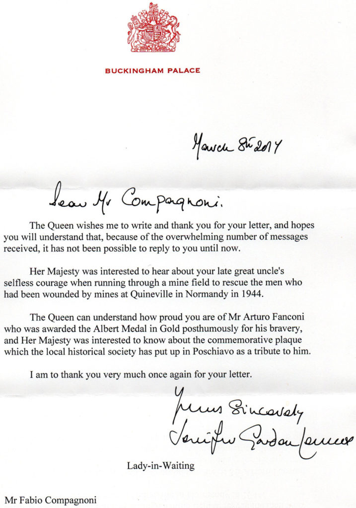 “Dato che i genitori di Arturo avevano ricevuto la medaglia dal Re d’Inghilterra, – spiega lo stesso Fabio Compagnoni – e che la “Albert Medal in Gold” è stata conferita soltanto 45 volte (Regno Unito, Impero Britannico e Commonwealth), ho pensato bene di avvisare la Casa Reale del riconoscimento poschiavino. Qualche giorno fa, precisamente l’8 marzo, ho ricevuto la lettera di risposta da Buckingham Palace, affrancata con il timbro postale Reale, firmata da Lady Jennifer Gordon Lennox, per conto della Regina Elisabetta”.