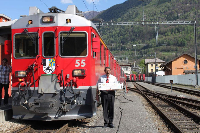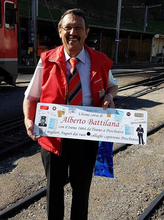 Venerdì scorso 7 aprile 2017, abbiamo avuto la gioia di incontrare sul locomotore 55, treno n° 1664 con partenza alle 15.40 da Tirano a Poschiavo l’amico Alberto Battilana, bigliettario e capotreno. Era il suo viaggio di commiato dalla RhB e in stazione a Poschiavo lo attendeva un folto gruppo di amici, colleghi e ex-colleghi che desideravano salutarlo e festeggiare insieme a lui il tanto ambito traguardo della pensione dopo 41 anni di servizio.