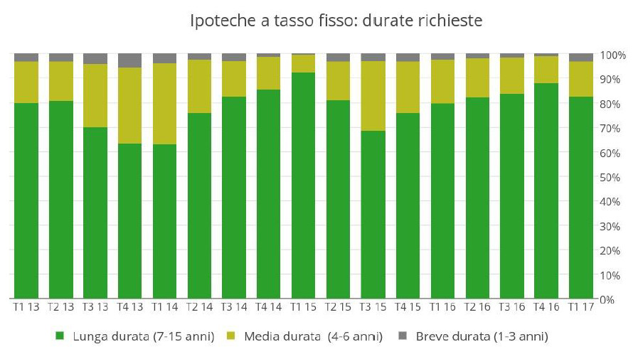 Per la prima volta da un anno e mezzo è aumentata la richiesta per le durate brevi e medie. Se la quota con cui erano richieste a fine 2016 era ancora, rispettivamente, dell’1,2 e dell’11,3 per cento, alla fine del primo trimestre si attestano sul 3,1 e sul 14,6 per cento. Nello stesso lasso di tempo, invece, le lunghe durate hanno subito una tendenza opposta passando da quota 87,5 degli ultimi mesi all’attuale 82,3 per cento.