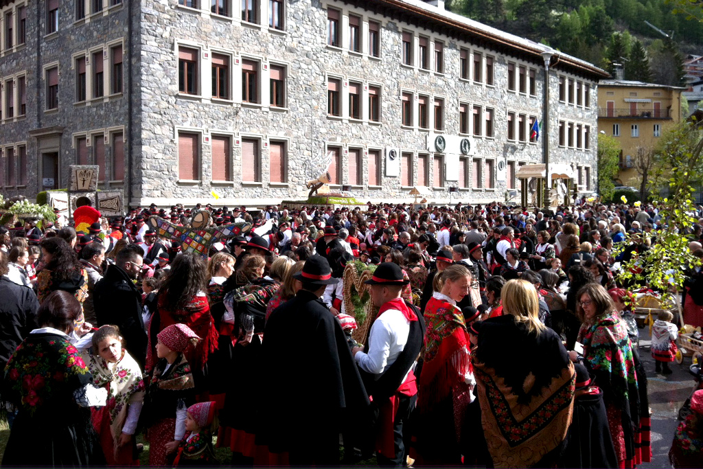 Non stupisce dunque che cellulari e droni trovino posto tra le portantine; domenica, al raduno in Piazza V Alpini, prima della sfilata per le vie di Bormio verso la Chiesa Parrocchiale, accanto alle numerose famiglie in abito tradizionale e ai tanti giovani, non mancava neppure un drone per le riprese dall’alto, strumento della contemporaneità che nulla toglie all’atmosfera del momento. Ma la tecnologia nella sua accezione più ampia è già apparsa tra i Pasquali; quest’anno una delle “portantine” per esempio aveva un titolo evocativo “Connessi a Te”, un richiamo alla dimensione spirituale e terrena della nostra vita, alla luce di occhi che sempre più spesso leggono solo schermi luminosi. Che ci si accosti per convinzione o per semplice curiosità la sfilata dei Pasquali non lascia indifferenti; spalanca piuttosto una finestra sull’articolato mondo dell’impegno tra le generazioni a sostegno di un comune sentire che è la base su cui edificare l’identità delle comunità. Abiti e costumi, in questa mattinata pasquale, raccontano innanzitutto di genti tenaci e resilienti, come solo i popoli di montagna sanno essere, ovunque ci si trovi nel mondo.