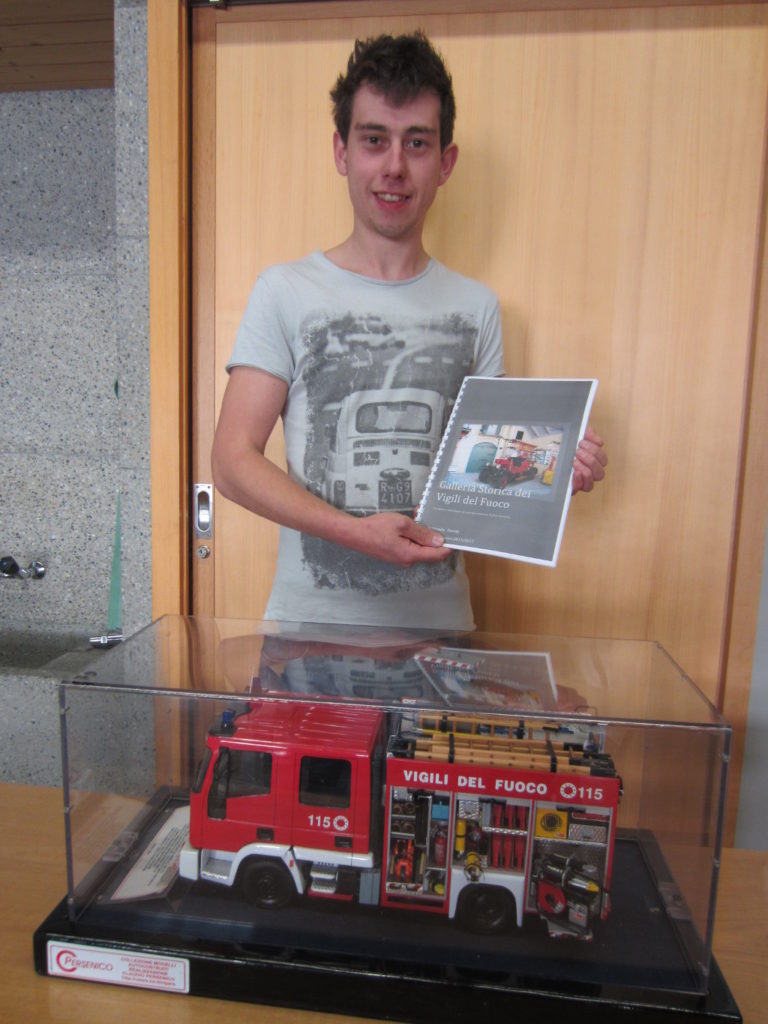 Ho inoltre scelto di presentare un pezzo raro: una Fiat Brevetti risalente al 1908 (unico mezzo risalente a quegli anni in Italia). Infine ho stilato un’ intervista a Claudio Persenico, ex vigile del fuoco in pensione, con un breve racconto della sua vita e della sua passione per i Vigili del fuoco.