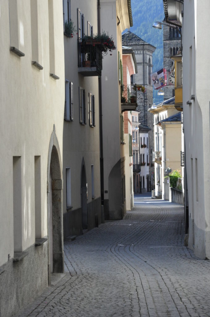 Con gli occhi è facile guardare Poschiavo, a patto di non limitarsi semplicemente ad attraversarla rimanendo sulla strada cantonale. Per chi arriva da nord in auto (in treno è un’altra magia!), scendendo dal passo par di arrivare in un posto triste, e la strada accanto al fiume appena passato il ponte di Cimavilla, con il viale alberato sul finale, non basta a creare bellezza. Se uno però è attento, riesce, nell’attimo in cui si affronta la curva sul ponte, ad intravvedere la Via da mez, una stradina leggermente sghemba, bellissima, prima vera promessa di quello che Poschiavo, entrandoci dentro, potrà regalare agli occhi! Ma si deve essere curiosi, si deve voler tornare a scoprire dove porta quella strada, posteggiare ed entrare in centro.
