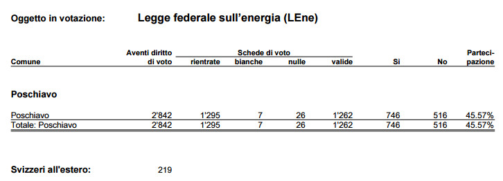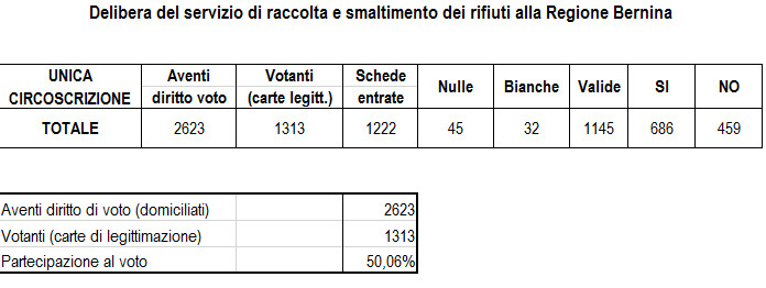 Nella giornata di oggi si è votato a Brusio e Poschiavo. Oltre che per la Legge Federale sull’Energia si è votato anche per la “Delibera relativa al servizio di raccolta e smaltimento dei rifiuti alla Regione Bernina”.