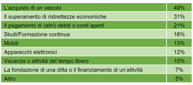 I crediti privati sono richiesti prevalentemente per finanziare l’acquisto di un veicolo. La metà dei beneficiari di un credito che hanno partecipato al sondaggio dichiara di aver chiesto un credito privato per finanziare la propria auto. Nei territori rurali, addirittura, è oltre il 60 per cento dei beneficiari ad essersi servito del credito privato a questo scopo. Al secondo posto tra i motivi principali per avvalersi di un credito privato c’è il superamento di periodi di ristrettezze finanziarie (31 per cento). Una persona su cinque ha invece indicato di aver utilizzato il credito privato per pagare fatture aperte o debiti di altro tipo.