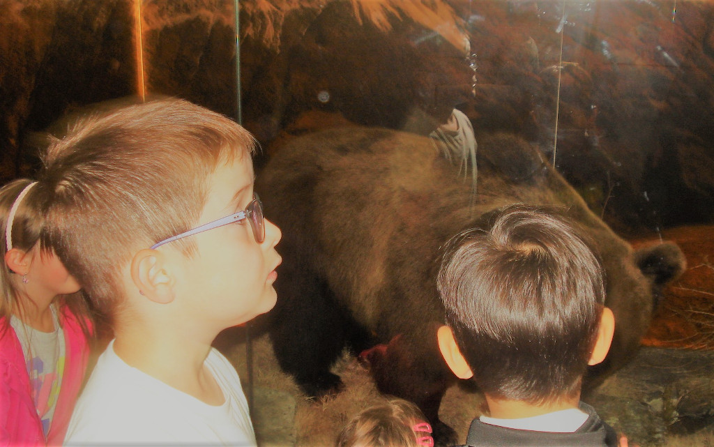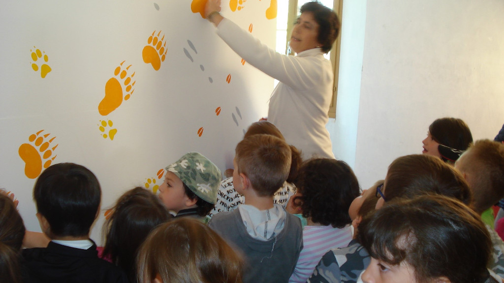 Loretta Ferrari accoglie i bambini della scuola dell’infanzia di Brusio con gioia e ci guida attraverso il tempo, l’habitat, le vicissitudini e le passioni che M13 ha vissuto in Valposchiavo in modo delicato e gentile, quasi a mitigare ciò che per un certo tempo l’orso ha rappresentato per la nostra valle.