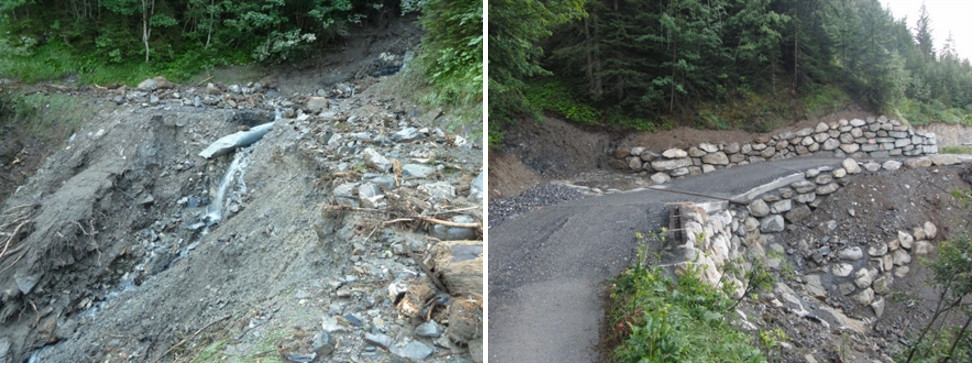 Comune di Küblis: forti temporali verificatisi nel mese di giugno 2013 hanno causato notevoli danni alla strada forestale. La strada è stata ripristinata grazie alla messa in sicurezza dell’alveo del torrente e della scarpata nonché alla realizzazione di muri di sostegno