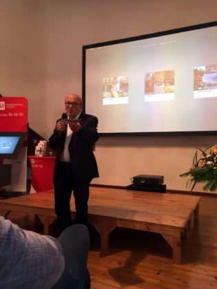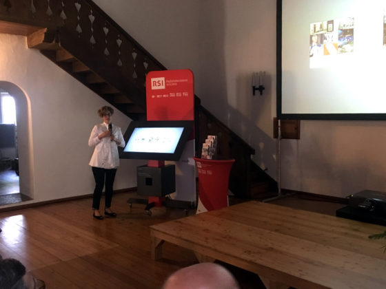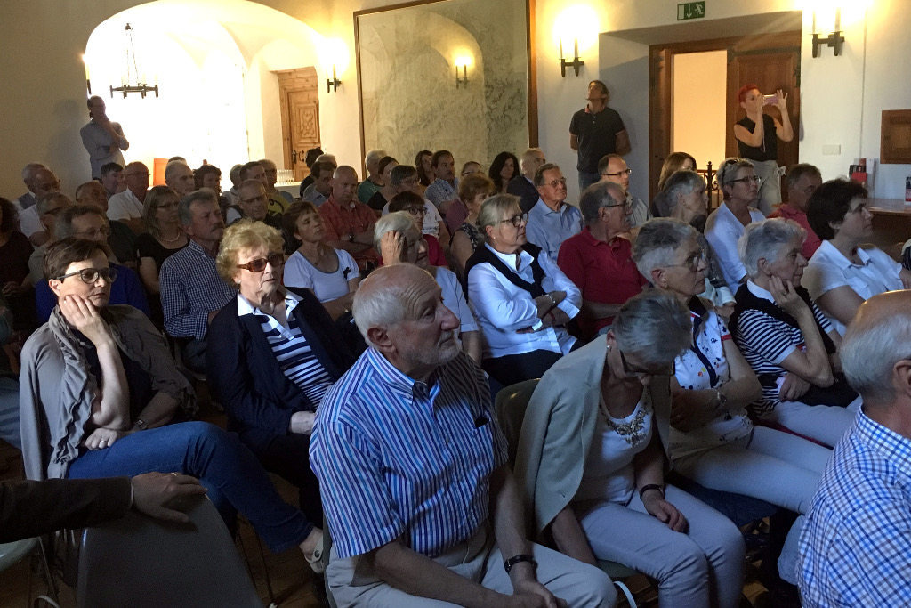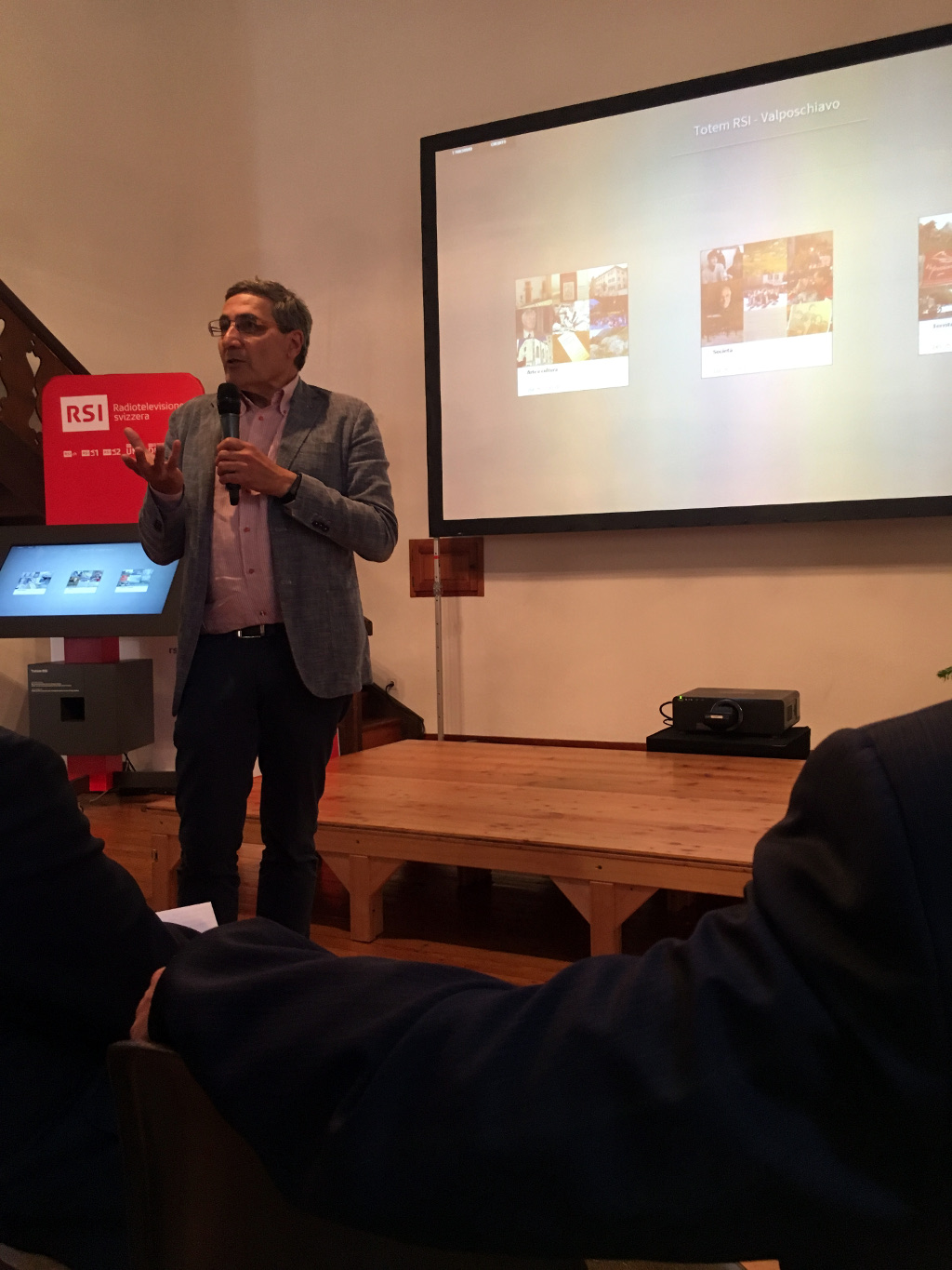 La presentazione si è svolta in Casa Torre, dove il numeroso pubblico è stato accolto dal direttore del museo poschiavino Paolo Raselli, felice di poter annunciare quest’importante novità. Hanno poi dato il benvenuto al pubblico Maurizio Canetta e Luigi Pedrazzini, presidente della CORSI, la società che rappresenta gli ascoltatori e gli spettatori della RSI. Il microfono è poi stato ceduto a Tosca Dusina, la curatrice del progetto, che spiega e mostra i contenuti multimediali. Il Totem è suddiviso in tre categorie principali, a loro volta divise in altre sottocategorie che comprendono vari temi come: i giovani, i migranti, l’arte, gli edifici religiosi e molti altri.