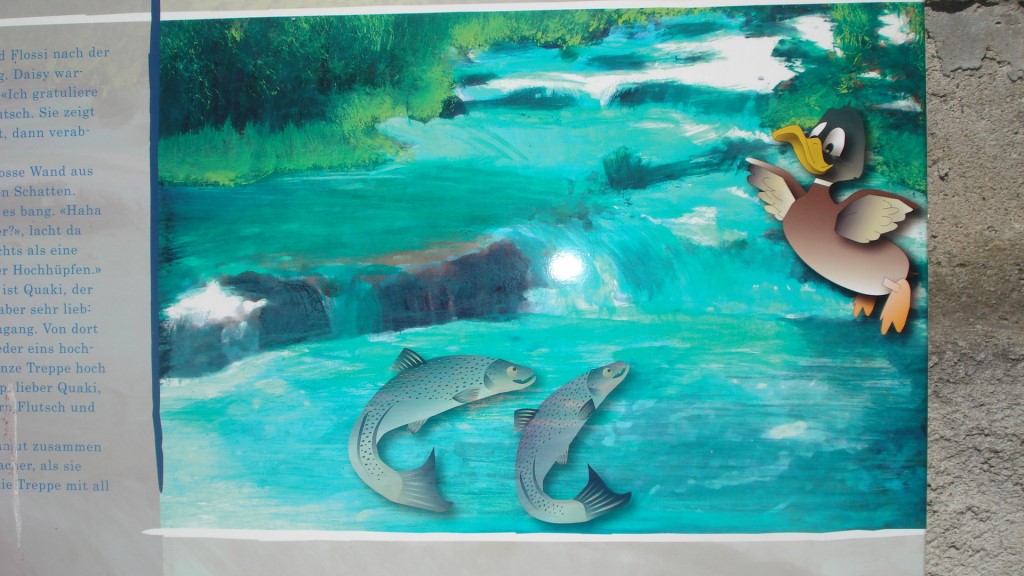 Un viaggio accompagnato da tavole esplicative e simpatiche che raccontano la storia dei due pesciolini marito e moglie e degli animaletti che incontrano sul loro percorso. Ma anche un’immersione nella natura, nei colori dei fiori, nel canto degli uccellini, nello sciabordare dell’acqua del ruscello da un lato e del fiume dall’altra. Abbiamo ascoltato, contato le varietà di fiori, ammirato i colori, osservato affascinati le alghe fiorite, segno di un ambiente sano e incontaminato, inspirato il profumo dell’erba. In un batter d’occhio eravamo al biotopo a scrutarne il fondo per scorgere i girini, le chioccioline e i numerosi insetti che sfioravano l’acqua creando dei perfetti cerchi concentrici sulla sua superficie!
