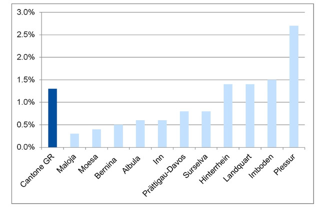 Grafico: Quota di aiuto sociale per distretti, Cantone dei Grigioni, 2015