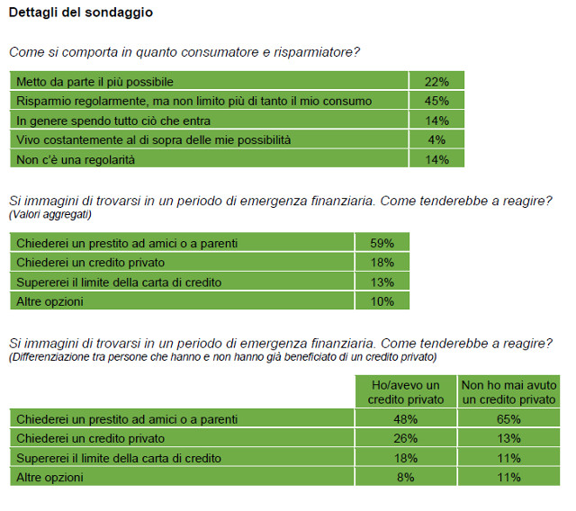Alla domanda su come reagirebbero in caso di ristrettezze economiche gli svizzeri dimostrano di avere una tendenza chiara. Circa il 60 per cento degli intervistati in una situazione del genere chiederebbe un prestito ad amici o parenti. Una persona su cinque circa ricorrerebbe a un credito privato qualora le finanze iniziassero ad andare male, mentre il 13 per cento manderebbe in rosso la carta di credito.