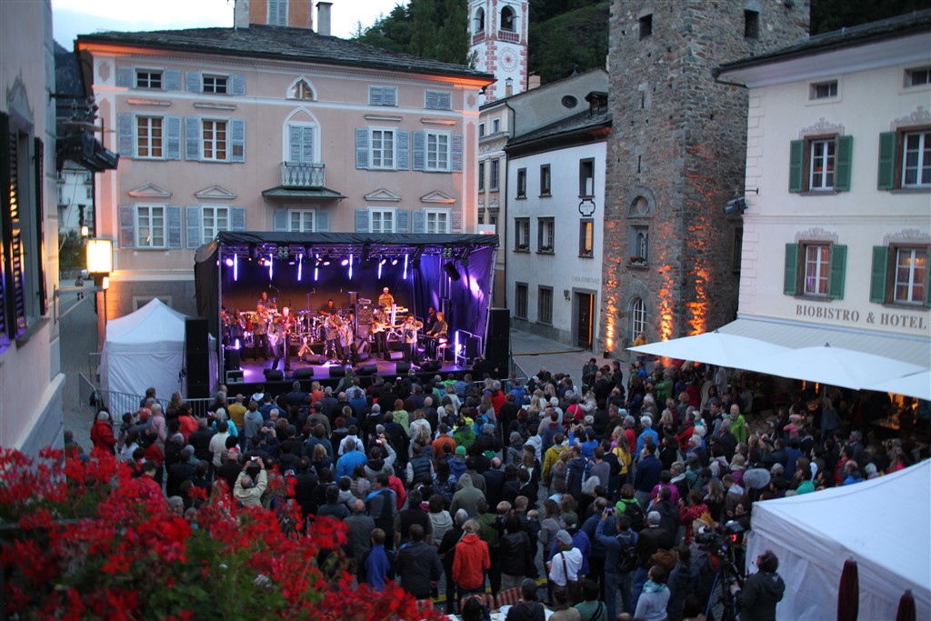 La presenza di un mostro sacro della musica degli anni ’70-’80 a Poschiavo può sembrare un po’ improbabile, ma è frutto di una collaborazione con il Festival da Jazz di St. Moritz. Il festival engadinese festeggia quest’anno il suo primo decennio, e per celebrare questa occasione è stata organizzata una serata extra muros. La nostra piazza ha fornito uno sfondo incantevole per lo show, grazie alla sua bellezza e al numeroso pubblico accorso per l’occasione.