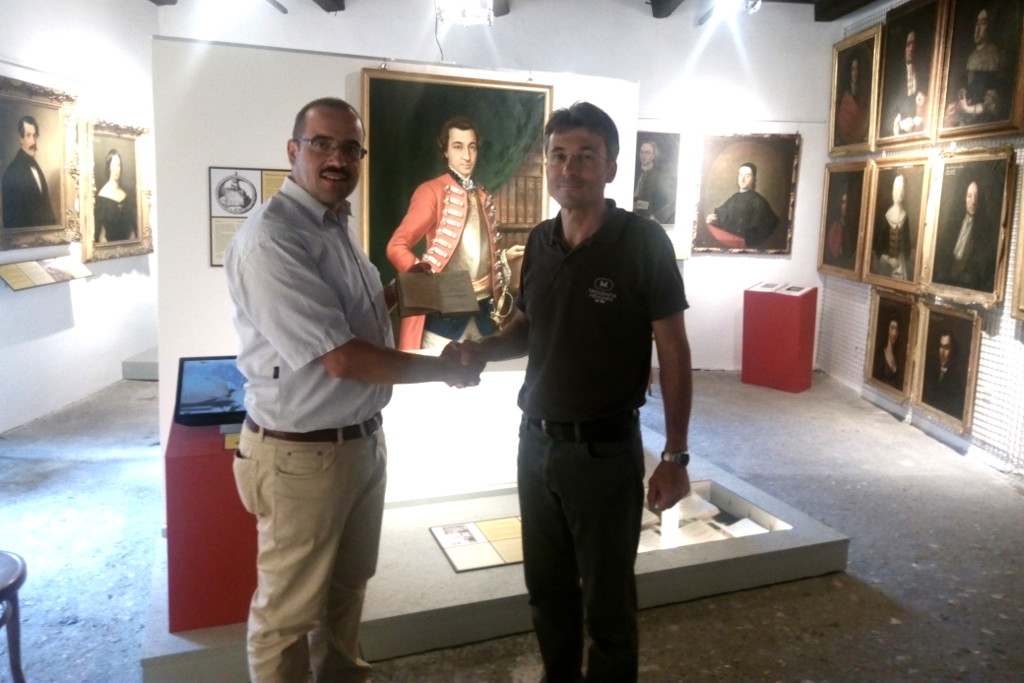 Il presidente del Museo poschiavino, Paolo Raselli e lo sponsor dell’operazione, la Tipografia Menghini rappresentata da Michele Menghini.