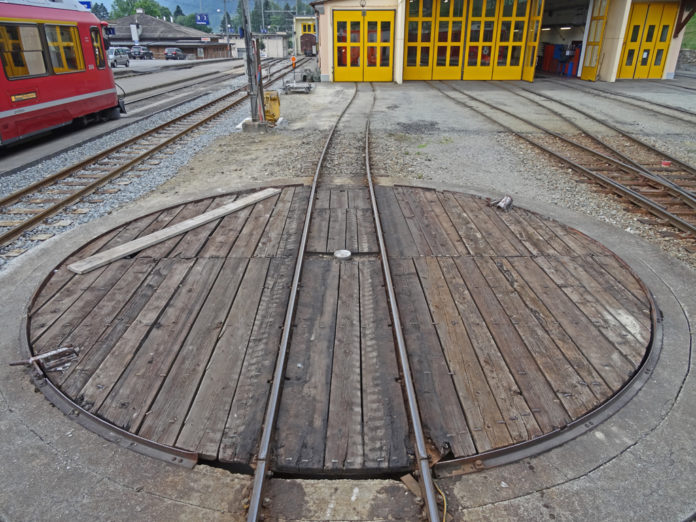 La piattaforma girevole esistente a nord delle officine della Ferrovia Retica a Poschiavo sarà mantenuta anche dopo la ristrutturazione della stazione. Utilizzata per invertire il senso di marcia delle locomotive, è una preziosa testimonianza della vecchia Ferrovia del Bernina.