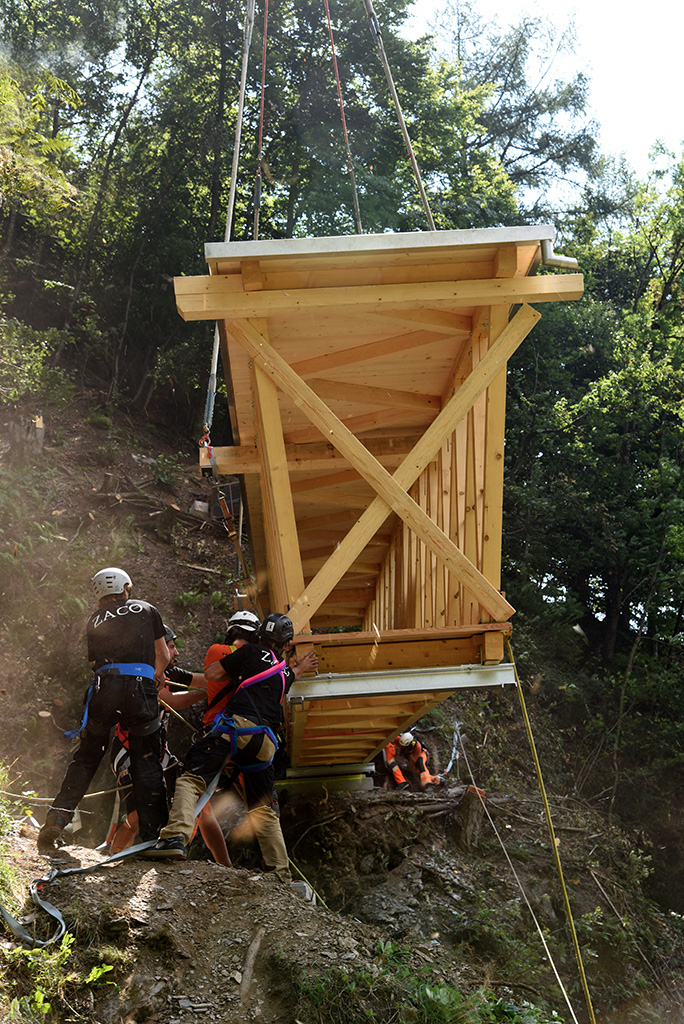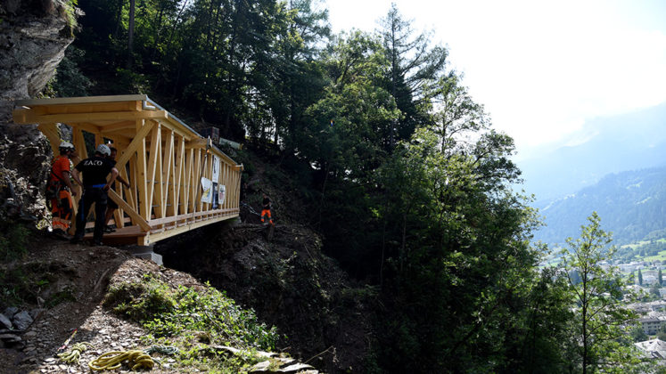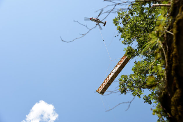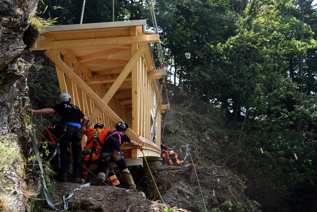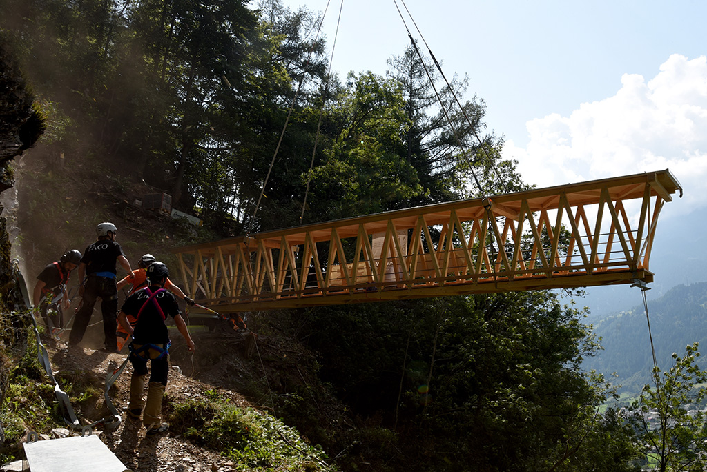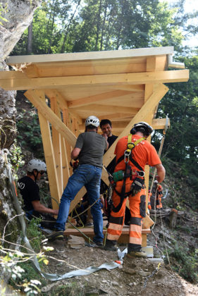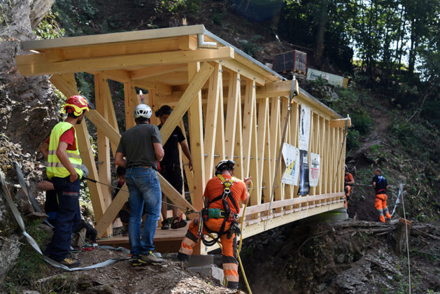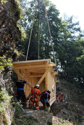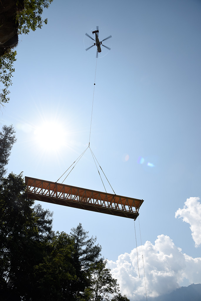 L’operazione è durata pochi minuti. Il tempo di osservare l’enorme elicottero librarsi praticamente fermo nell’aria e la passerella era sganciata. A quel punto gli operai hanno potuto passare al fissaggio della struttura in legno. Dal parcheggio Mengotti la passerella è facilmente visibile, anche grazie al taglio di alberi fatto in precedenza.