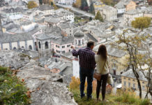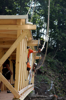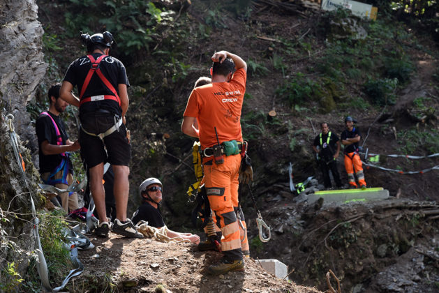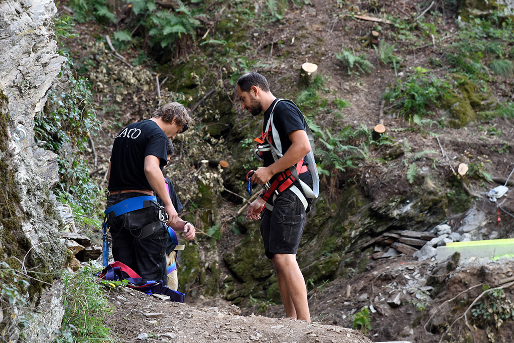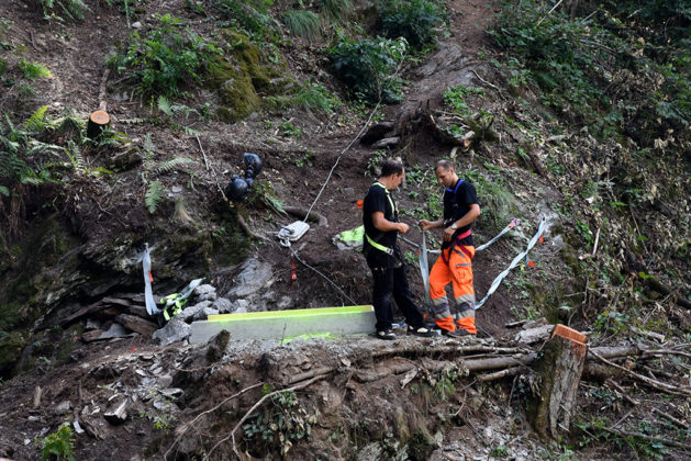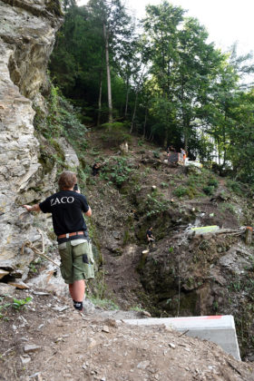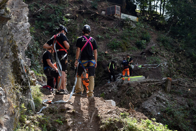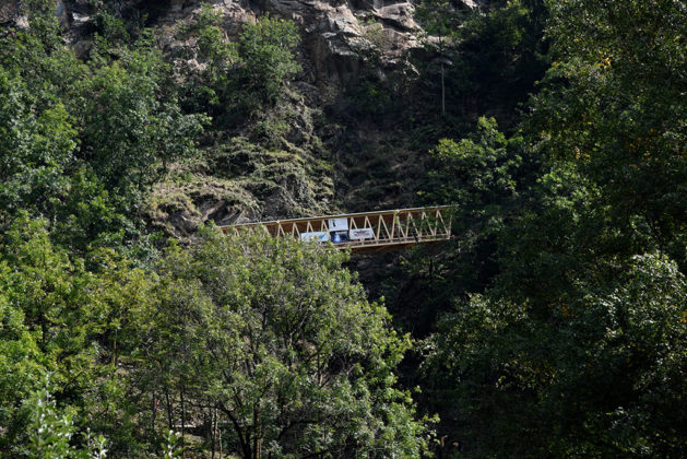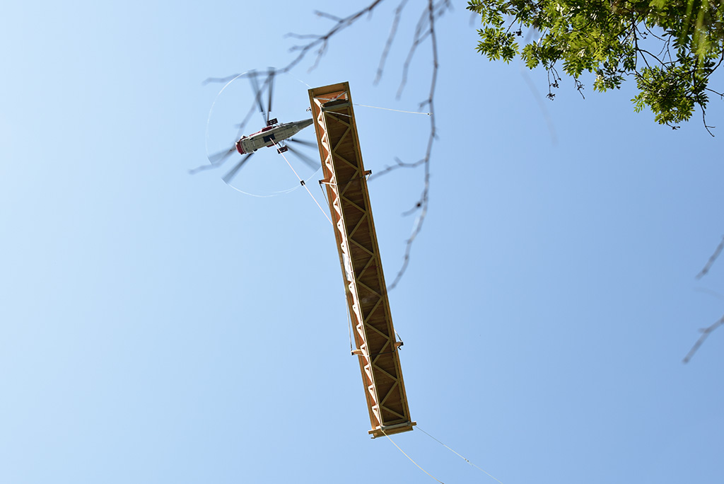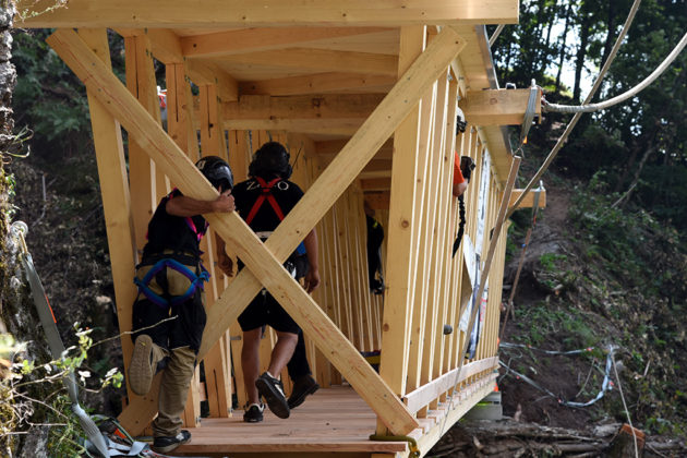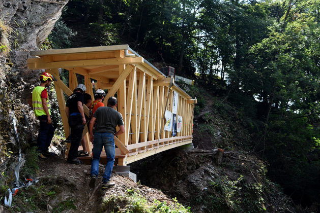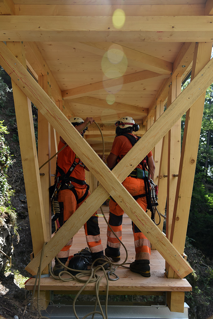 L’operazione è durata pochi minuti. Il tempo di osservare l’enorme elicottero librarsi praticamente fermo nell’aria e la passerella era sganciata. A quel punto gli operai hanno potuto passare al fissaggio della struttura in legno. Dal parcheggio Mengotti la passerella è facilmente visibile, anche grazie al taglio di alberi fatto in precedenza.