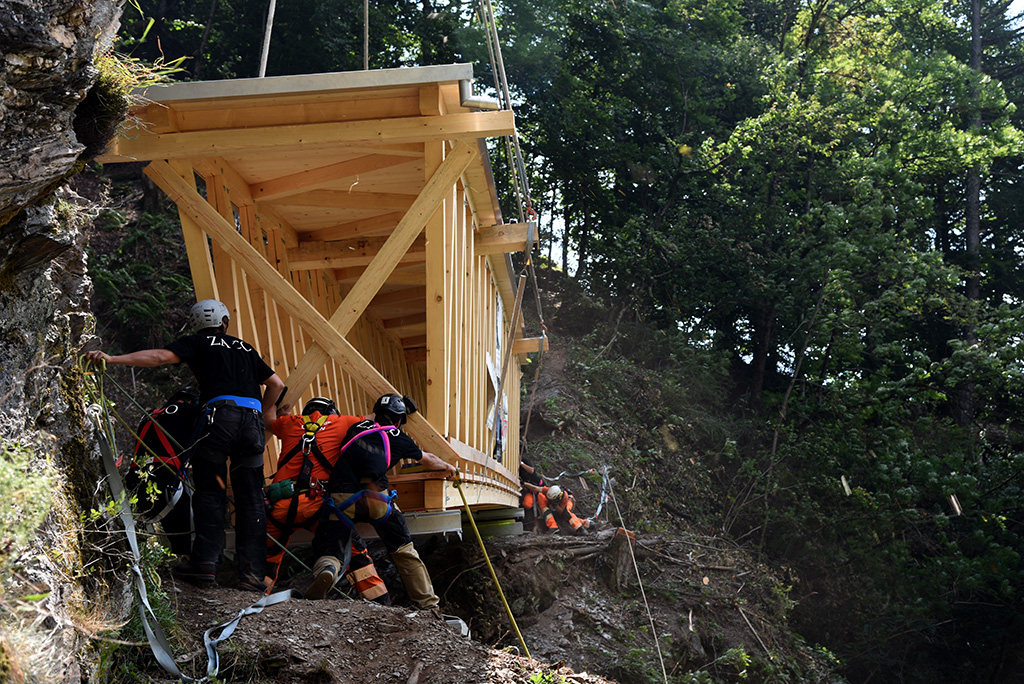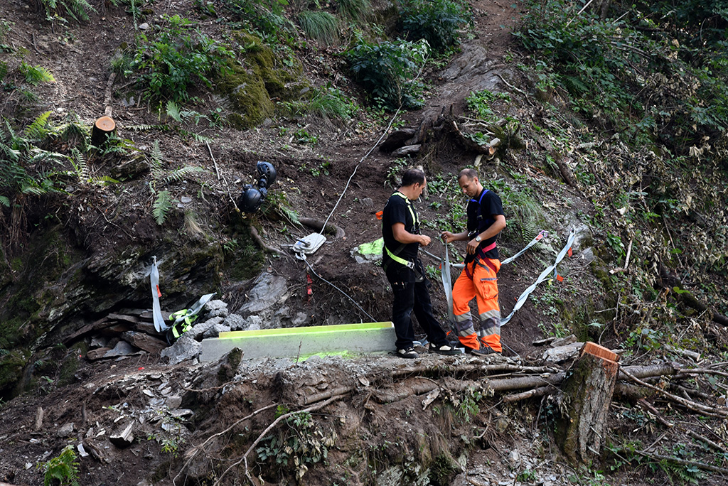 Apparentemente senza difficoltà alcuna, il pilota ha piazzato in posizione perfetta il manufatto del peso di ben 4200 kg, facilitando così il lavoro al gruppo di persone addette ai lavori. Ad attenderlo sul luogo prestabilito vi erano gli operai della ditta ZACO Sagl con il personale di terra della HeliSwiss.