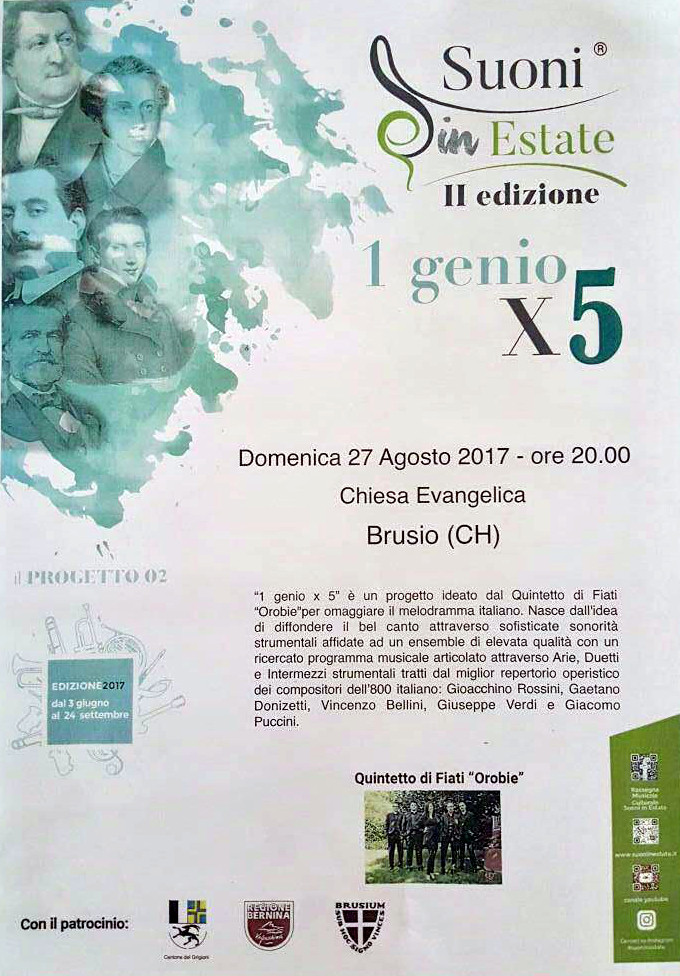 Domenica 27 agosto alle ore 20.00, presso la Chiesa Evangelica di Brusio, è in programma lo spettacolo del Quintetto di Fiati “Orobie” nell’ambito del progetto “1 genio x 5”.