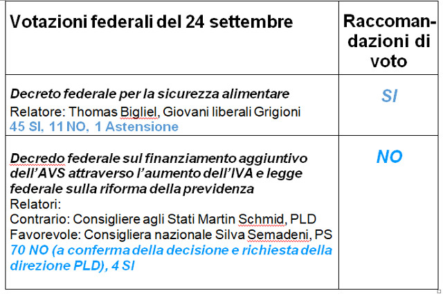 Le raccomandazioni di voto del PLD.I Liberali Grigioni sono le seguenti: